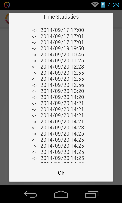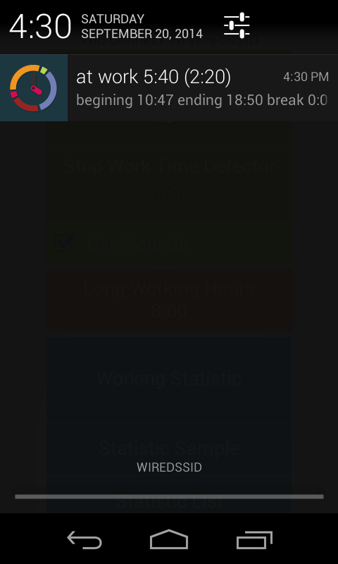 Программа привязывается к WiFi на вашем рабочем месте. Когда вы приходите в офис она регистрирует момент подключения к сети как начало рабочего дня. Когда вы покидаете офис то программа регистрирует отключение от WiFi и считает это время окончанием рабочего дня. Так же обрабатывается и выход на обеденный перерыв. Данные сохраняются в таблице и списке. Программа так же напоминает звуком об окончании рабочего дня и показывает перерасход времени. В панели уведомлений вы увидите статистику - когда вы пришли на работу когда можете уйти с учетом всех перерывов, сколько вы находитесь на работе и сколько осталось работать. Обратите внимание что программа никаких данных по WiFi не принимает и не передает.