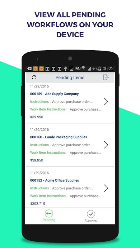 Приложение полностью поддерживает структуру безопасности AX и обеспечивает топ способность управления одобрить, отклонить или комментарий на рабочем процессе, просматривать историю и вложения через своих Android устройств.