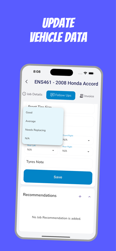 Отслеживание времени в режиме реального времени: механики могут отслеживать приход и отсчет времени, сканируя номерной знак автомобиля с помощью мобильного приложения, обеспечивая точное отслеживание трудозатрат без необходимости использования компьютеров.