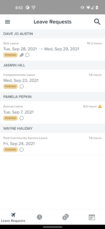 - Управление сотрудниками: менеджеры сотрудников могут утверждать или отклонять запросы на отпуск, расписания и расходы. Посмотреть смены в составе.