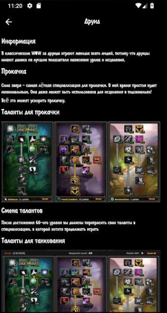 Приложение поможет вам определиться с классом, скачать нужные аддоны, а так же выбрать места для прокачки. В зонах прокачки можно выбрать фракцию Орды или Альянса, и найти помощь где и в какой локации качаться, как в Восточных Королевствах, так и Калимдоре. Помощник содержит информацию о всех классах World of Warcraft Vanilla (Варкрафт Ванилла): друид, охотник, маг, паладин, жрец, разбойник, шаман, чернокнижник и воин.