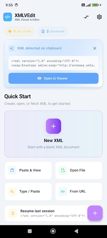 • Древовидное представление — Интерактивное XML-дерево с возможностью разворачивания/сворачивания и копирования элементов касанием