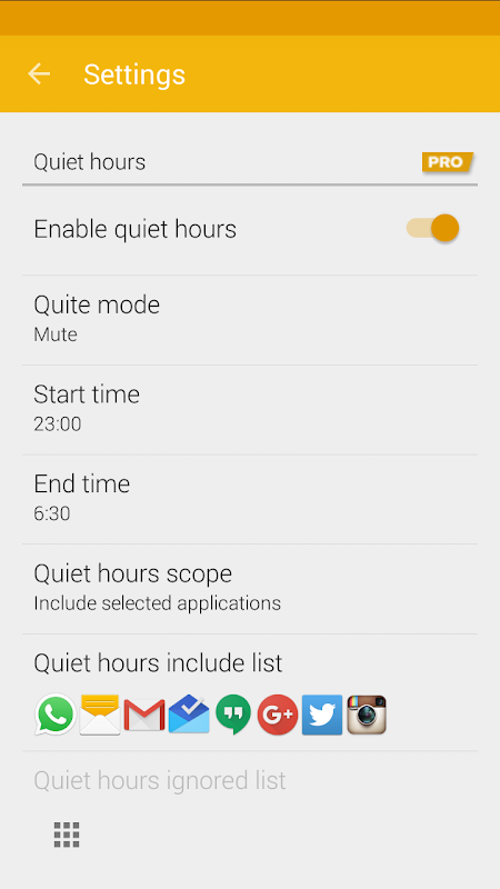 ☆ Set quiet-hours globally or on a per-app basis (requires Lollipop and above)