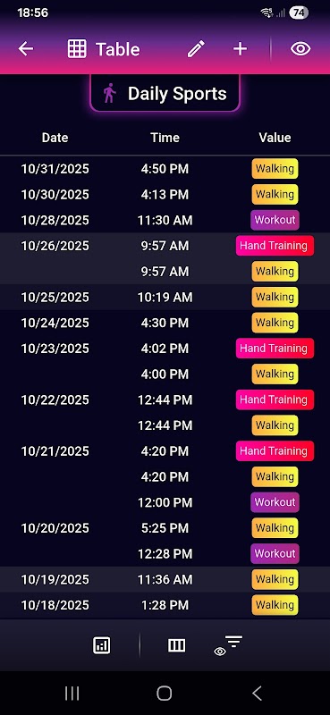 Создавайте собственные серии измерений (например, артериальное давление, ежедневные задачи, например, тренировки, или привычки, например, употребление кофе), регистрируйте данные и отслеживайте прогресс в понятных таблицах и диаграммах.
