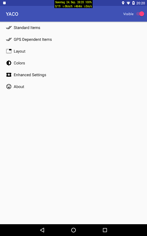 "YACO" comes from "Yet another [Clock] Overlay" - I put "clock" in brackets, as it started with a clock, but now it grew to an app showing a whole bunch of information! What could the YACO acronym now stand for? I have no idea.