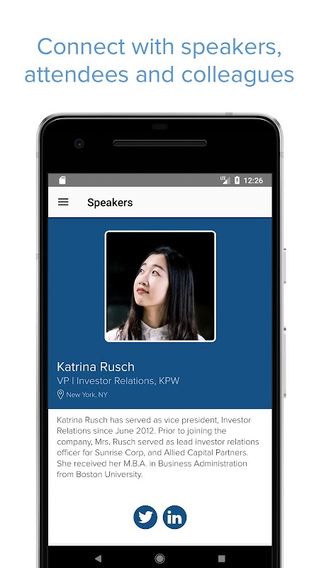 • Участники — получайте биографии участников, спикеров, участников и ключевых контактов.