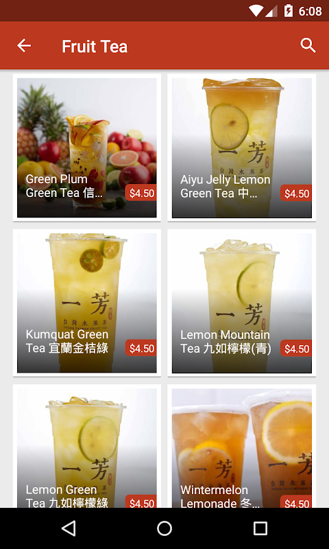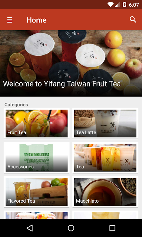 «Android-приложение Yifang Taiwan Fruit Tea» предлагает всю информацию, которую вам нужно знать, прежде чем отправиться к нам и решить, что вы хотите попробовать сегодня. Просмотрите категории и предметы, чтобы выбрать то, что вам нравится.