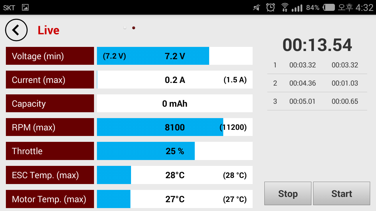 Скорость вращения двигателя работать на экране живого изображения, ток, напряжение батареи, температура ESC, проверьте открытие передатчика акселератора