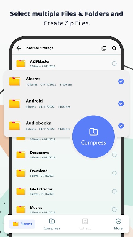 Сжимайте все типы файлов и создавайте zip-файлы, а также извлекайте сжатые zip-файлы в любое место на вашем телефоне.