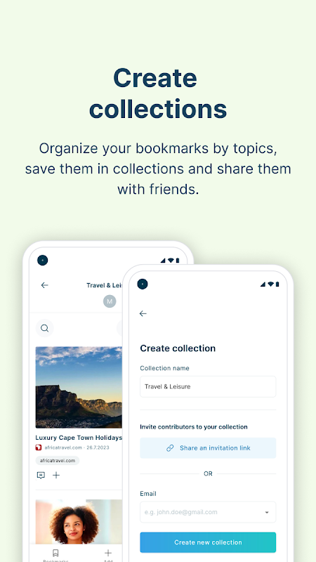 Organize your bookmarks by topics and save them in collections. Invite other contributors to be part of your collection, while always having control. This way you can easily find your next summer vacation destination together or collect important contents for your project in one place.