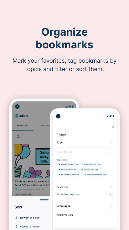 With rubra, you can get started right away without setting up an account. If you prefer to have your bookmarks synced and easily accessible across devices, setting up an account is an easy and convenient option. The choice is yours.