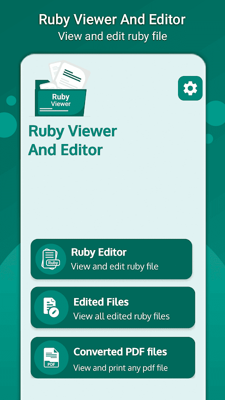 Ruby file reader is a free app to view ruby files in a better way. It has exciting features and easy to use UI. All edited files of ruby file opener can be viewed within app so that to view it in editor easily. All edited files of ruby file reader will be removed when user uninstall the app, so before uninstalling the app keep your files in a safe place.