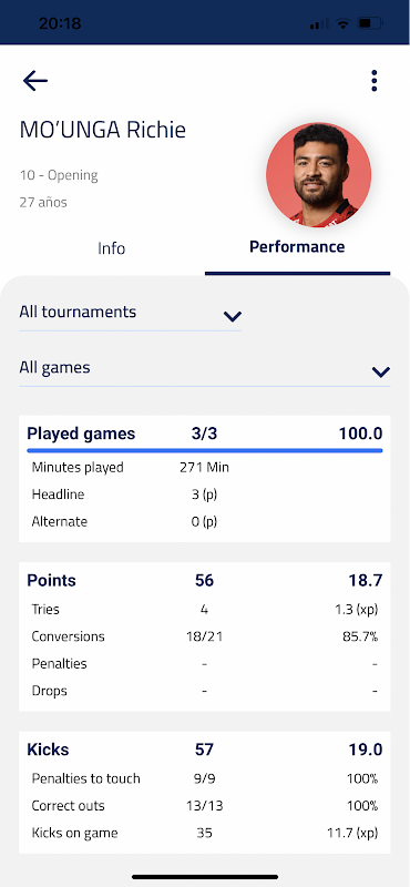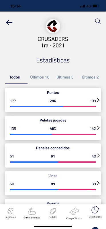 The PRO option allows you to record all the actions of a Rugby match and its Players, leaving everything recorded to be able to see, in the form of statistics, everything about your team and its players.