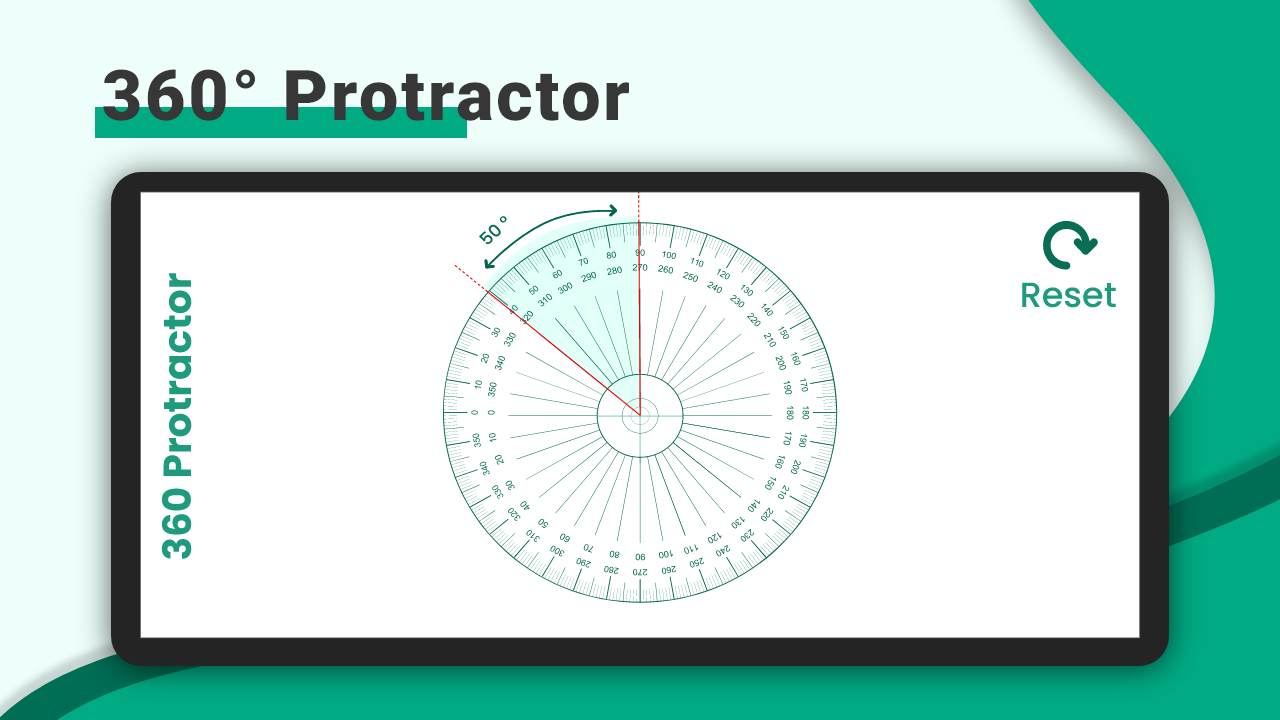 The protractor tool in the ruler app measure works as a protractor angle finder. You can use this phone protractor tool in the ruler tape measure length. This protractor angle finder in ruler measuring tape also extends to a 360 protractor that measures the overall angle of an object.