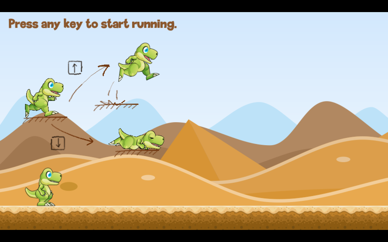 A dinosaur in an endless desert. Jump over cactus and rocks on your way and collect points.