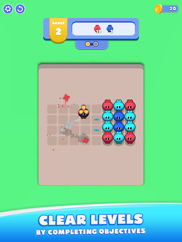 A puzzle game where players strategically move colored blobs on a grid to form lines of three or more of the same color. Each time a line is formed, it disappears, helping to clear the board.