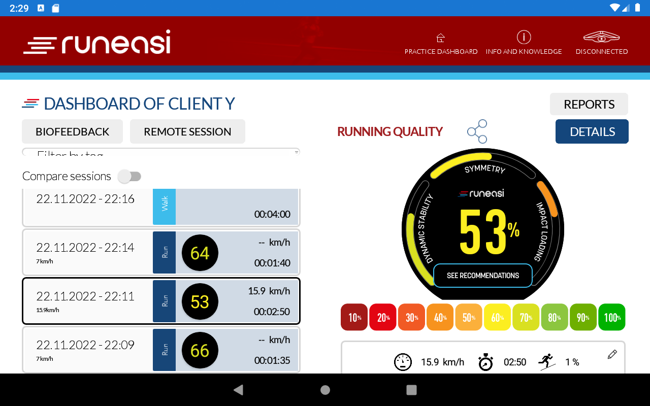Runeasi Running Quality is a global score from 0 to 100 that captures the overall movement quality of running. It's based on 3 crucial biomechanical components that are linked to running injury risk and performance. The score empowers your athlete's education, pinpoints their weakest link (i.e. component) for you, and provides you with individualized recommendations on how to improve it!