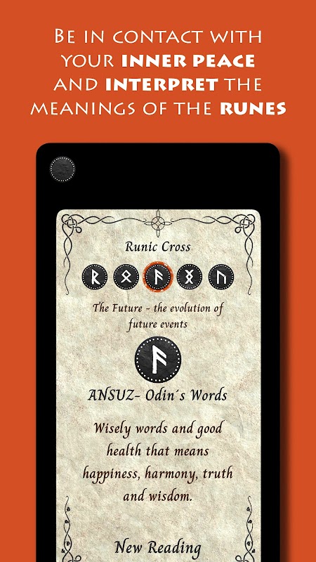 With this app you can be in contact with your inner peace and interpret the meanings of the runes readings. To improve your experience we designed the Runic Cross with an intuitive interface that allows you to immerse into the runic answers. This divination will bring the real message of Odin to your life.