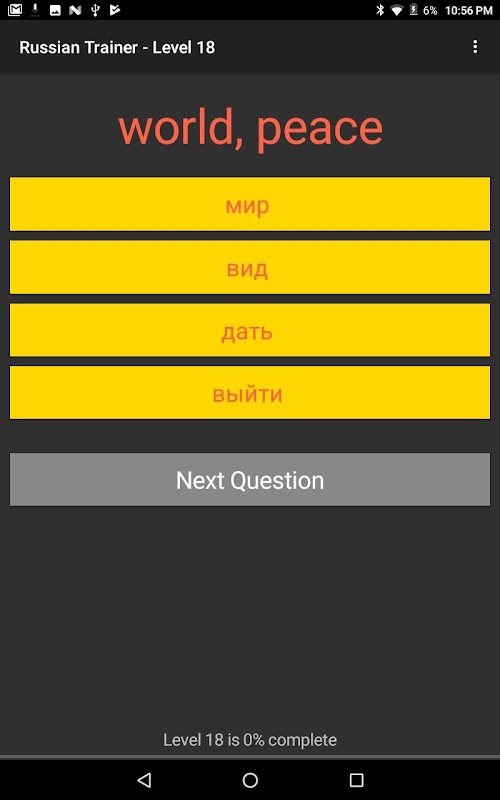 Study 1000 Russian English words in multiple choice format. English and Russian voice audio included. The 1000 questions are divided into 100 levels with 10 questions each to make your training easier. There is classical music playing to help with your concentration. Each level tracks your score until you reach 100% mastery of that level. This is my first language app so please be patient and feel free to give me feedback.