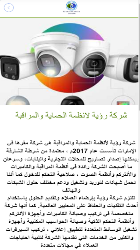 شركة رؤية لأنظمة الحماية والمراقبة هي شركة مقرها في الإمارات تأسست عام 2017م ، معتمدة من شرطة الشارقة ويمكنها إصدار تصاريح للمحلات التجارية والبنايات، وسرعان ما أصبحت الشركة رائدة في أنظمة المراقبة والكاميرات والأنتركم وأنظمة الصوت ، صلاحية التحكم للدخول كما أننا نحمل شهادات لتوريد وتشغيل ودعم مختلف حلول الشبكات والهاتف.
