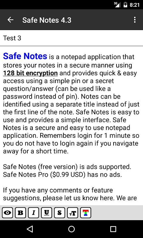 Safe Notes is a notepad application that stores your notes in a secure manner using 128 bit encryption and provides quick & easy access using a simple pin number or a secret question/answer (can be used like a password instead of pin). Notes can be identified using a separate title instead of just the first line of the note. Safe Notes stores all your data on the device instead of uploading your personal information to the internet. Safe Notes is easy to use and provides a simple interface. Safe Notes is a secure and easy to use notepad application.
