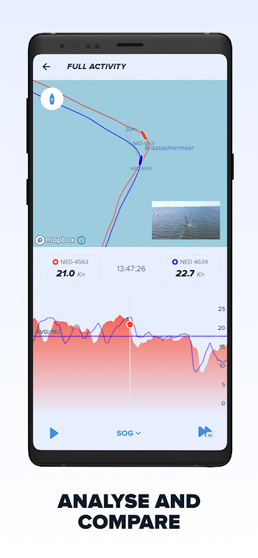 Relive your trip on a clear visual map with a graph, down to every second. Analyse your speed, heel, pitch and COG and see where you won or lost. Learn from your finest moments or worst mistakes. And compare your data with your training and racing partners who are at the same time and location on the water – live or afterwards.