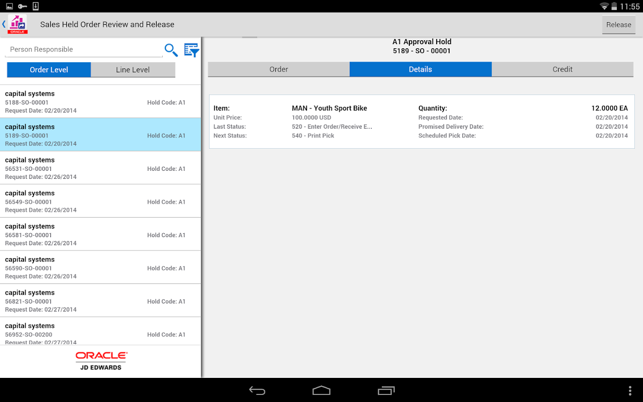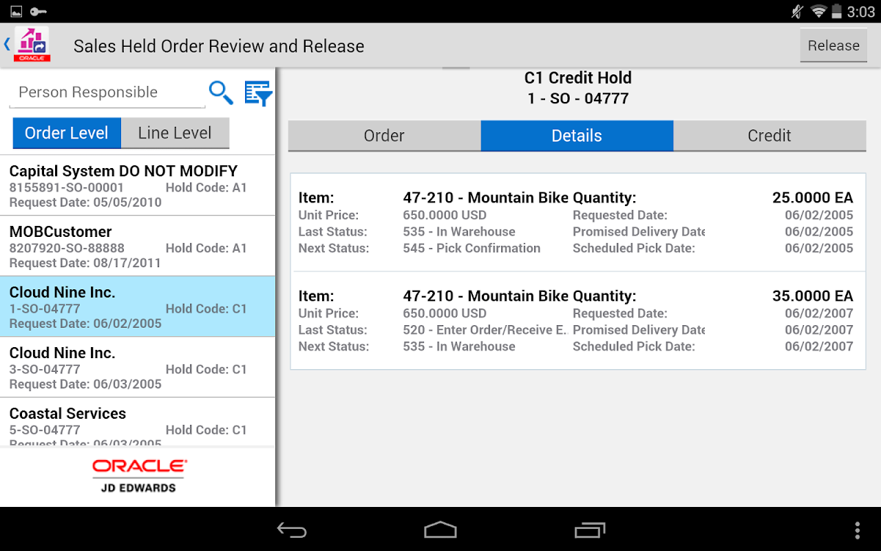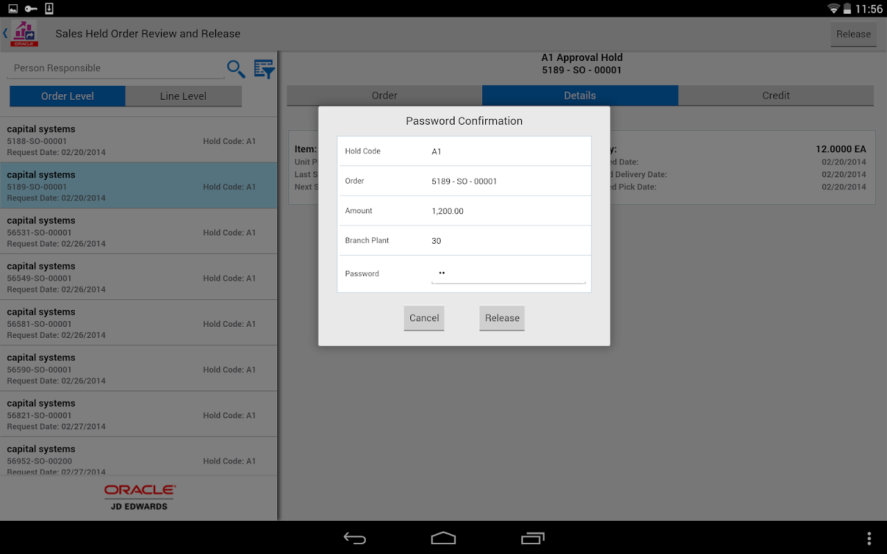 JD Edwards EnterpriseOne Sales Held Order Release for Mobile Tablet allows sales or financial personnel, such as a credit manager, to review and release the sales held orders in the JD Edwards EnterpriseOne system. To have the system process an order that is on hold, the user must release the hold using the correct password. Users can review all types of holds on a specific sales order and select the holds to release.