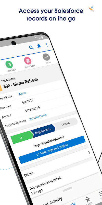 Salesforce, wherever you are. Manage your day, update records, view dashboards.