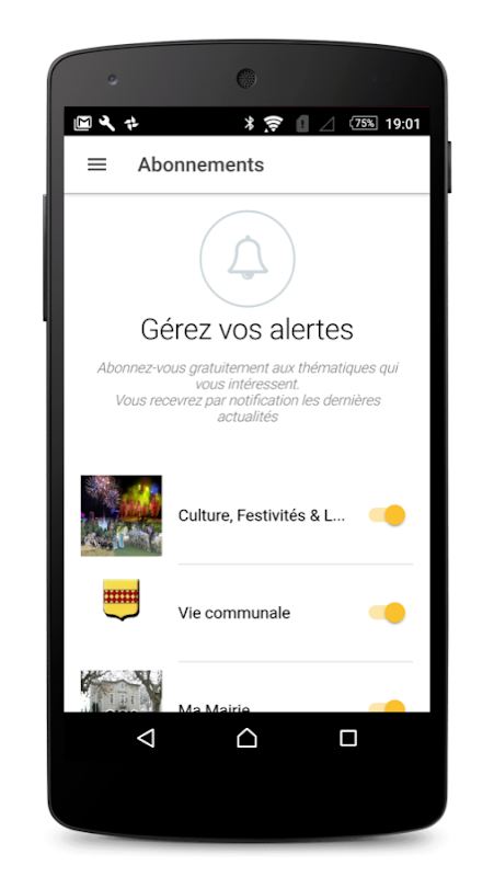 single-use application that can receive notifications in the form of the latest information on the life of the town based on free subscriptions chosen (Culture, Festivities and Leisure, Education ...)