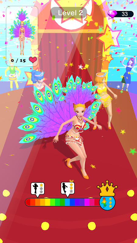 Move left and right to collect the feathers on the road and make them a nice decoration.To be the best looking samba dancer,you should avoid inappropriate attire or strange coats,of course, you should not hit the guys on the road or you'll lose some feathers or costumes.