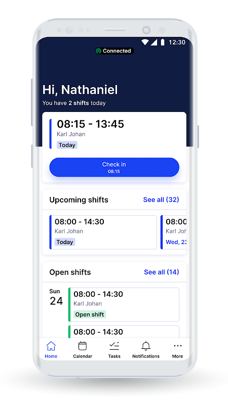 With SameSystem Check-in, you register attendance with a single push in the app, both when arriving, departing, or going for a break.