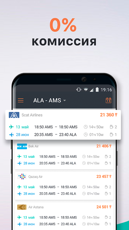 Билеты от 700+ внутренних и международных авиакомпаний, таких как Air Astana (Эйр Астана), FlyArystan, SCAT (СКАТ), Qazaq Air (Казак Эйр), Bek Air (Бек Эйр), Aeroflot (Аэрофлот), Turkish Airlines (Турецкие авиалинии), МАУ, Люфтганза, Флай Дубай и многие другие;