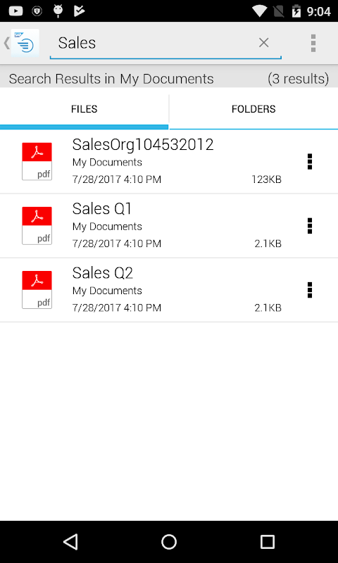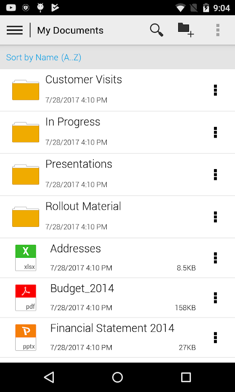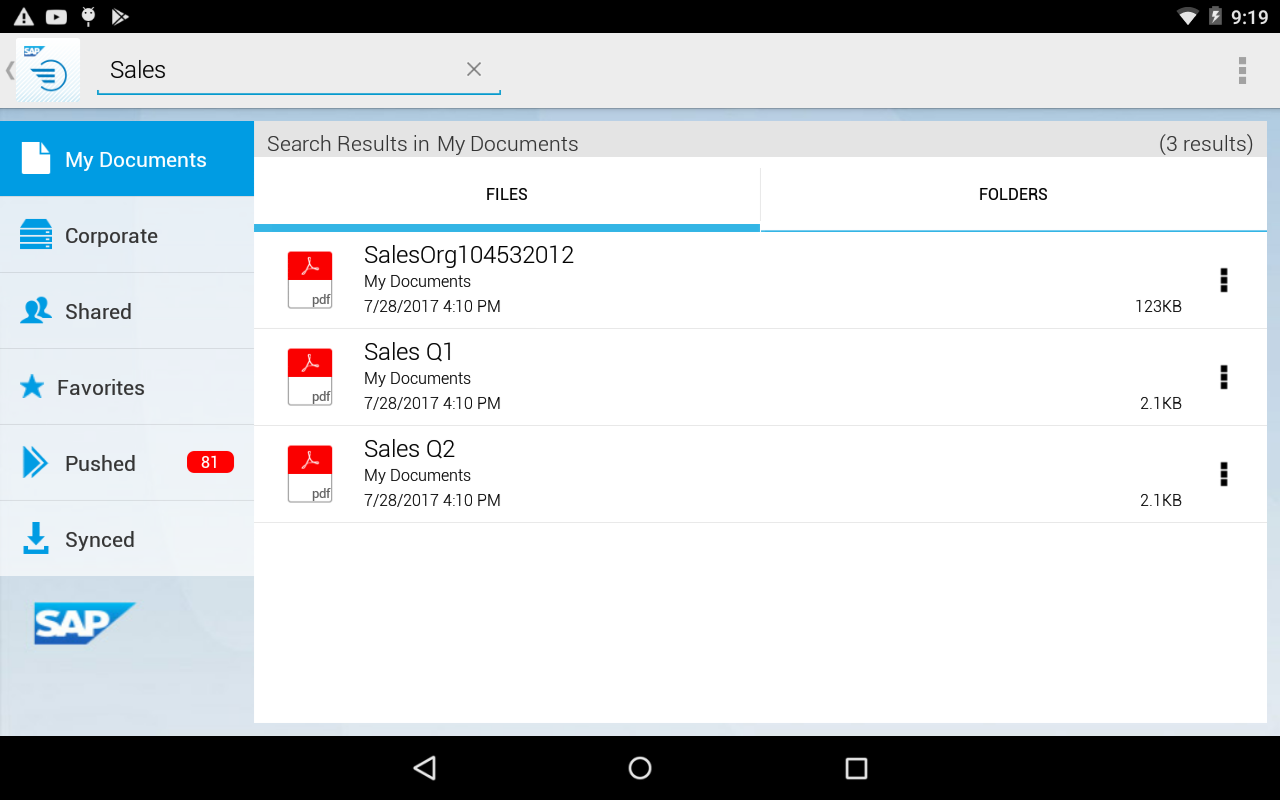 The SAP Document Center mobile app for Android lets you securely bring all your personal and business documents and content with you wherever you go. Unlike manual file transfers using shared folders or e-mail, this app enables you to quickly and easily access and collaborate on files synchronized with the cloud, your computer, and on-premise corporate document management systems - anywhere, anytime.