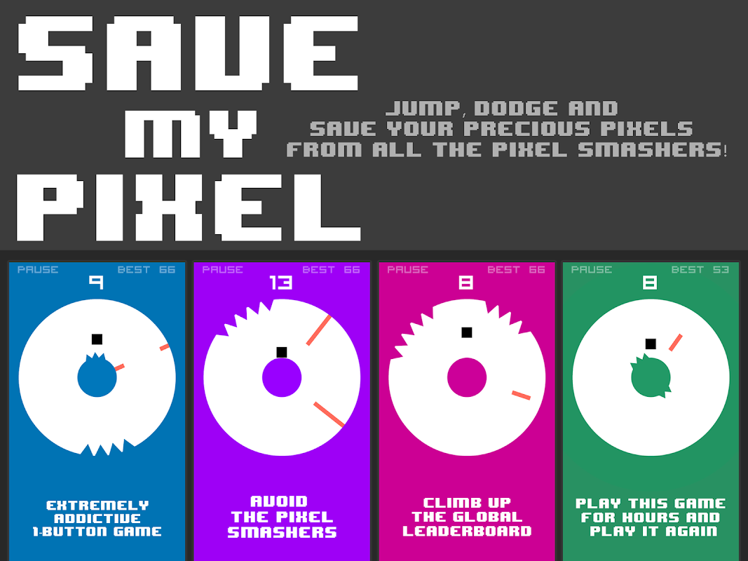 Save your precious pixel bits from all the bit smashers! Save My Pixel is a simple but extremely addictive 1-button arcade game. Jump and avoid getting hit by the bit smashers (obstacles), dodge the spikes and survive as long as you can.