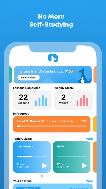2. Flexible scheduling: book lessons easily using the mobile calendar feature. Lessons are available from 7am - 11pm Korea standard time.