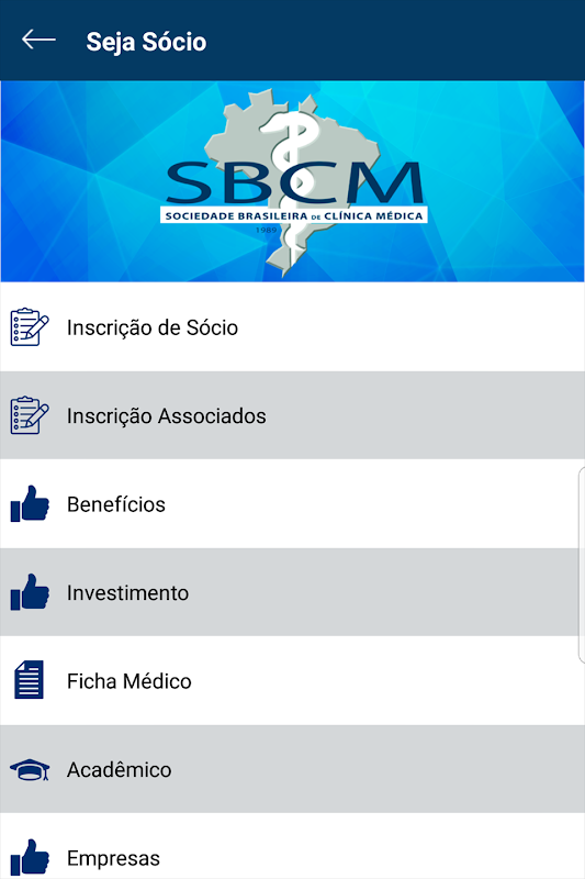 The application is intended to bring to the public, associated and non-associated, information about the activities of the Brazilian Society of Internal Medicine, as a mirror of the contents on the site and especially offering the ease of media, allowing even join via mobile.