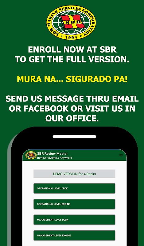 SBR Marine Services Corporation is proudly introducing the updated and one-of-a-kind mobile app review for Marine Deck and Marine Engine Officers! With its new features and up-to-date Questions, we make sure you pass your MARINA Licensure Examinations hassle free. You can now Review Anytime & Anywhere!