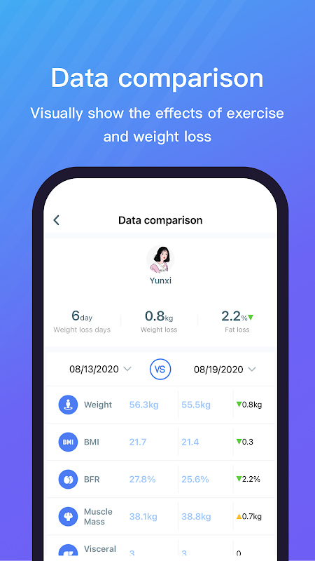 * Track the weight, body fat, body water, muscle, bone mass, daily caloric intake, visceral fat, and physique rating, fat-free mass, etc.