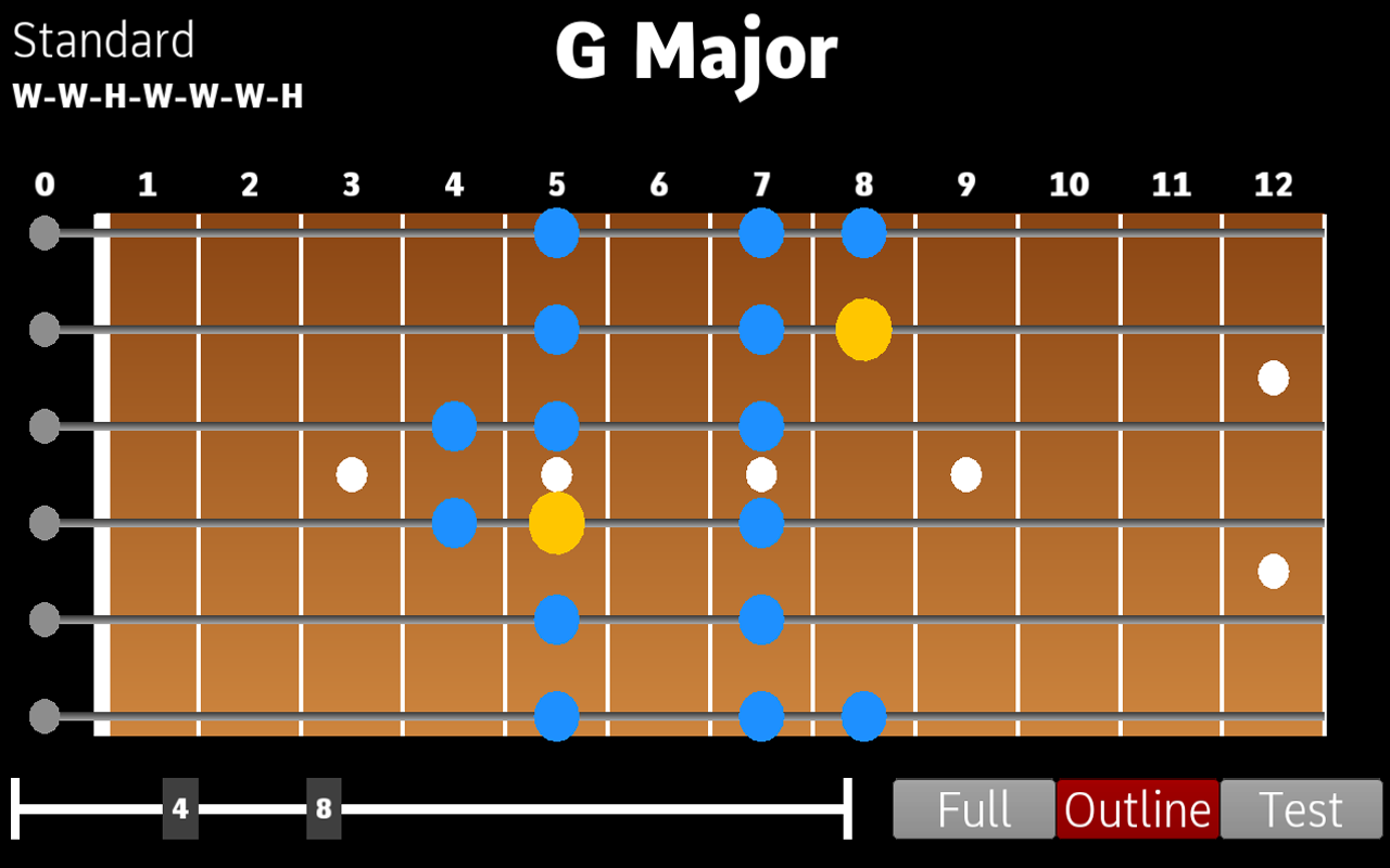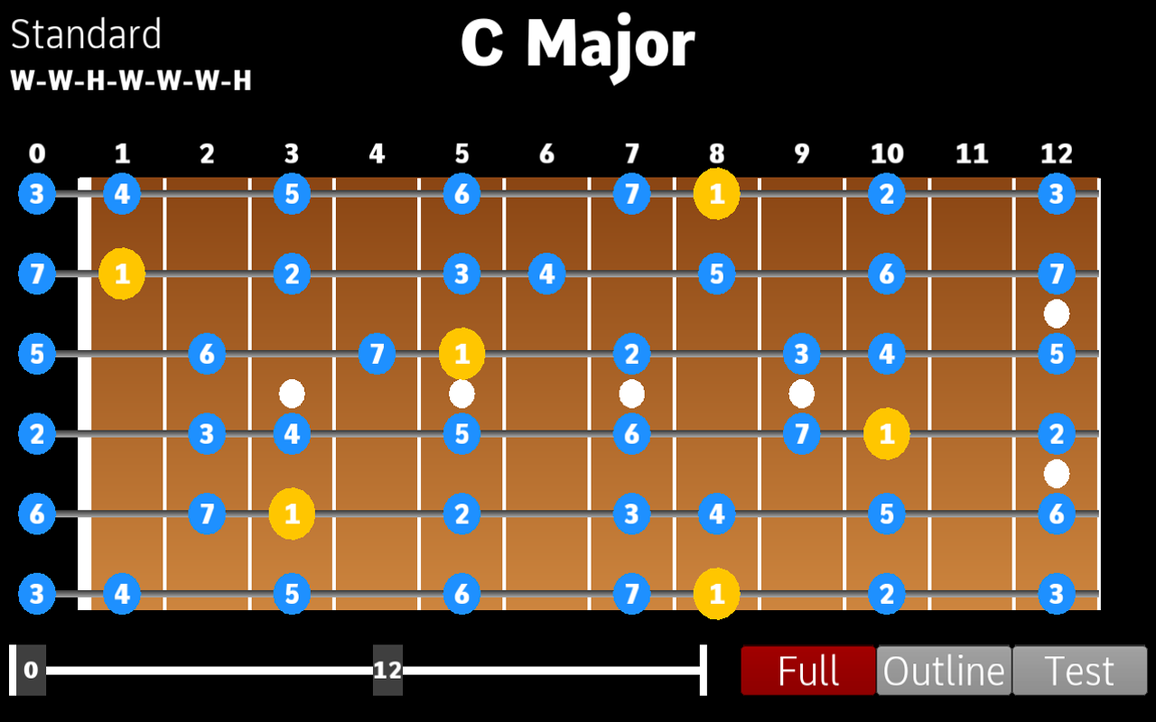 This interactive scale chart allows you to test your music scale knowledge. Toggle between the three disable modes. The full option shows all notes of the scale in either degree or note name notation. The outline options just shows the positions of the notes on the scale. The test option turns off all hints.