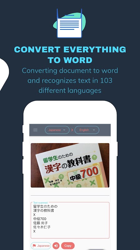 The application use multi-input as a camera takes a photo, import photo from image album or live scan for converting document to word and recognizes text in 103 different languages.
