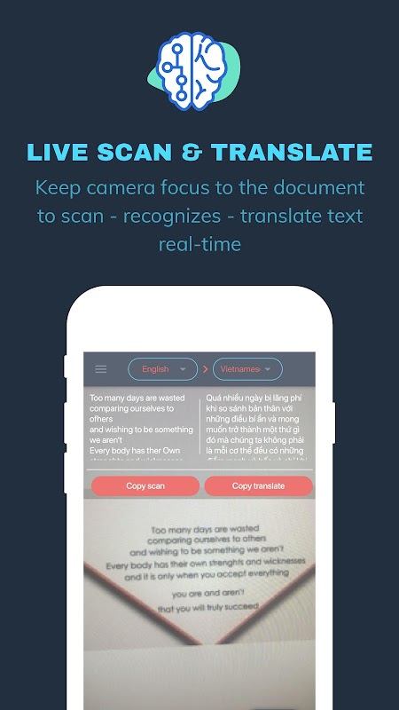 Scan everything application is utility application designed to provide for user features as scan the document and recognizes text in 103 different languages, translate the document scanned to multi-language with AI for high precision in every context. The application uses the library of Google as Machine learning Kit, cloud translate API. We hope to bring the best utility to users.