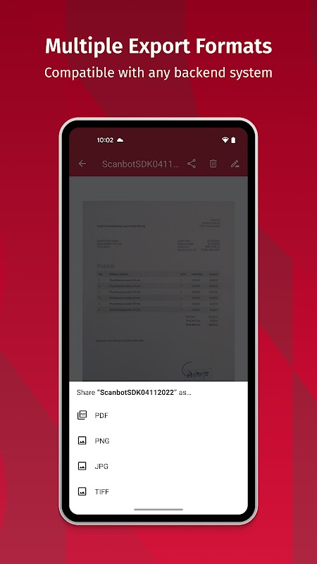 PDF, JPG, PNG, or TIFF – our export formats are compatible with any backend system that processes the scans your users create.