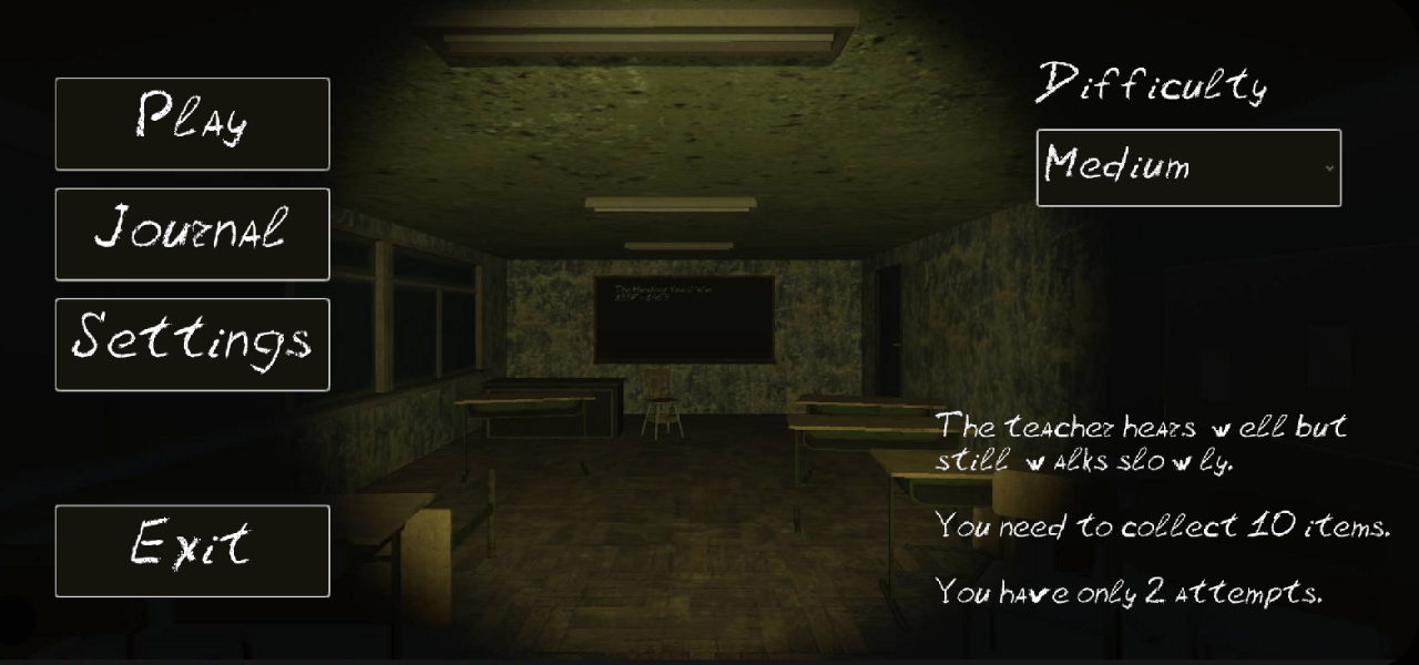 You have returned to your abandoned school to collect various items as keepsakes (pens, pencils, textbooks, notebooks, etc.). At first, the school seems empty, but soon you realize you are not alone. A blind undead teacher does not like visitors and kills anyone who disturbs the peace of the abandoned school. Although blind, the teacher has excellent hearing. He can hear your footsteps, the doors you open, and the items you drop, so be quiet. Good luck!