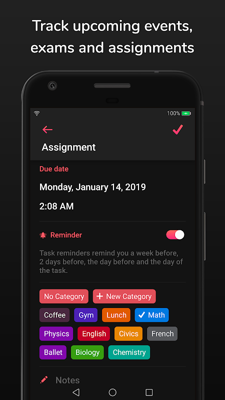 - Setup reminders for upcoming events, exams and homework assignments. These reminders will remind you a week before, 2 days before, 1 day before and the morning of the event to keep you on top of your game!