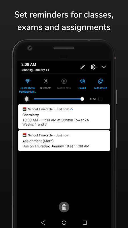School Timetable is the most easy to use, yet versatile scheduling, planning and organizing app for students of school, college or university. Easily keep track of your weekly school schedule and events, meet deadlines for homework assignments, exams and quizzes in this beautiful tracker accompanied by a homescreen widget. Check out the following features which makes School Timetable the most complete schedule organizer app for students: