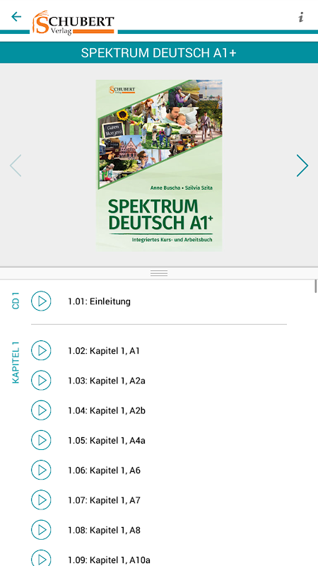 With SCHUBERT-Audio+Video, you can easily listen to the audio and video content of our books and their supplementary materials on your mobile devices. Currently, the content of SPEKTRUM DEUTSCH A1⁺, SPEKTRUM DEUTSCH A2⁺, SPEKTRUM DEUTSCH B1⁺, SPEKTRUM DEUTSCH B2, Begegnungen DaF A1⁺, Begegnungen DaF A2⁺, Begegnungen DaF B1⁺, Erkundungen B2, Erkundungen C1, Erkundungen C2, A-Grammatik, B-Grammatik, Geschäftliche Begegnungen A2⁺, Berufswege A2, Berufswege B1, Geschäftliche Begegnungen B1⁺, Auf Deutsch im Rhythmus!, Sag Hallo!, Schulzeit für Eltern is included; others are in preparation.