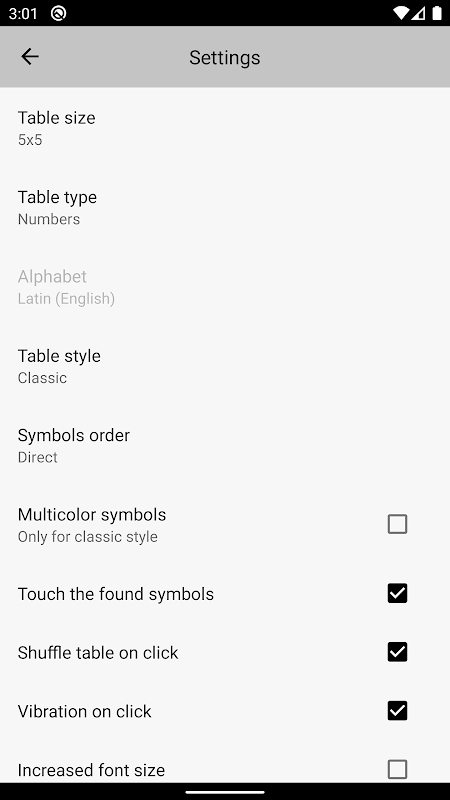 Especially note there is a mode as the Gorbov-Schulte tables. This test is designed to assess the speed of switching attention and can be used to determine professional suitability for professions that require increased concentration and quick response (for example, air traffic controllers, railway train drivers, etc.). You must alternate between numbers, black in ascending order and red in descending order: 1 black, 24 red, 2 black, 23 red, etc. It can be used for focus training as well.