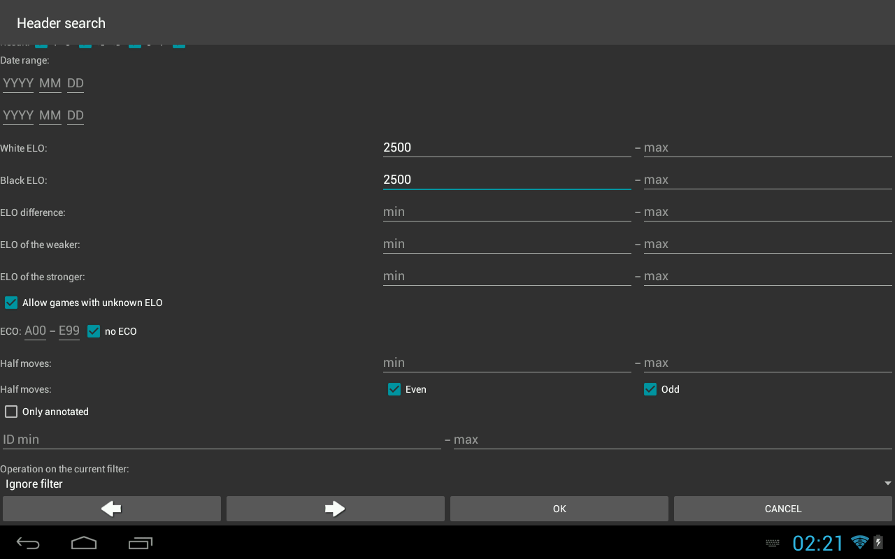 * Header search using player names, sites, events, dates, results, ECO, ELO ratings,…