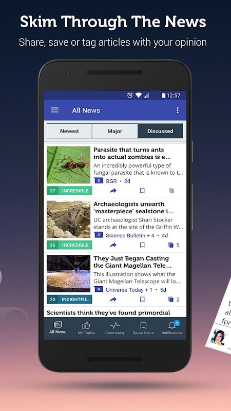 - Your very own news feed - choose the topics you want to follow and the topics you want to block - long tap a story to block the source