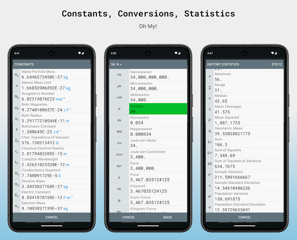 - A high-precision Scientific Calculator with Fractions, Complex Numbers, Physical Constants, a Unit Converter, Advanced Statistics, History & Memory Registers and a full-online Help Section.